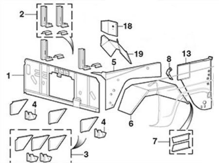 After I got my fenders and grill off, I realized the full extent of the damage I did to the front end when I rolled it on its side (10 years ago!). The driver's side inner fender (5) was pretty well crumpled, and the core support (1)was pushed back about 1/2" on the drivers side. You can see the crumpled outer fender in this picture and some of the damage (and rust) in this picture. I'll get some close up pictures of it all before I pull it off.